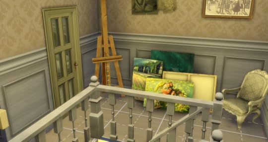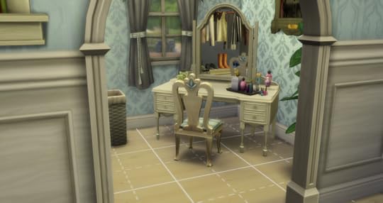 Floor plan of the first floor. The upper hallway is again quite large, but I used the empty spaces for crafting areas: painting, playing the organ, and a desk for other craftiness. To the right is the bathroom with double vanities, bath, and shower. To the left is the master bedroom with ensuite dressing room.