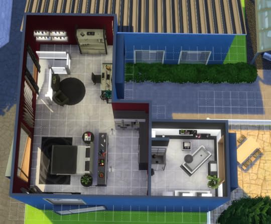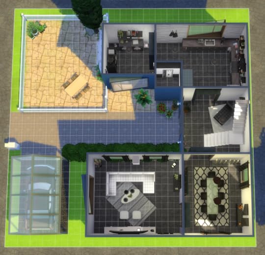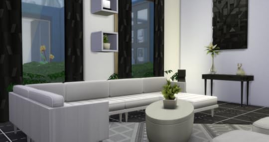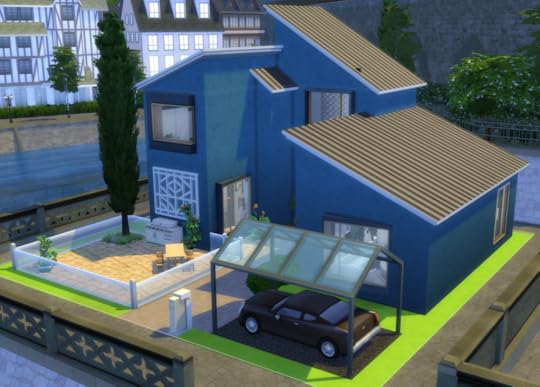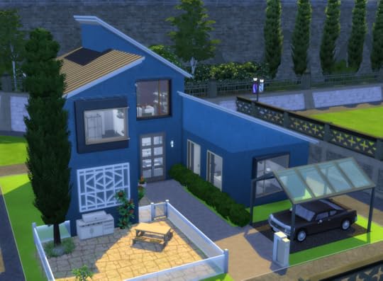 In this modern home with large windows and a carport, there’s room for two Sims. There is a small, enclosed garden at the front of the house.