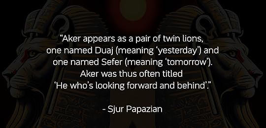 AkerAker is an Egyptian god depicted as two lions guiding the setting sun (or solar god) as it descends into the night.