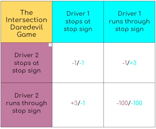 This constitutes a kind of “dilemma” of the kind found in game theory—as in the famous Prisoner’s Dilemma. In our intersection example, each driver may reap one of the following payoffs corresponding to each possible interaction: