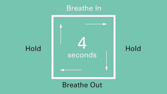 First, the body has many reactions to stress—potentially including rapid, shallow breathing. This panicked state is no good for anyone. So if you feel your heart thumping with uncomfortable urgency, there is a specific breathing technique which can get things under control. It’s called box breathing—and the rules are quite simple: Breathe in for 4 seconds, hold your breath for 4 seconds, breathe out for 4 seconds, hold your breath for 4 seconds, and repeat.