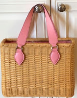 The bag has a rattan look. The awesome pink handles and interior with three pockets. A great size.