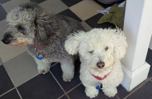 Yup, they are pretty adorable malti-poos, part Maltese and part Poodle. That's why I call them the Adora-poos. The smokey gray one is Jones, as in Indiana Jones. And the white one is smaller and often mistaken for a girl. He's Champ because he's our alpha. Jones rolls in around twenty-three pounds and Champ at nineteen.