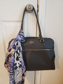 I feel pulled together when I carry it, and sometimes, I'll run to the store in my yoga pants and a T-shirt, but if I'm carrying the bag, it's all good. I have a scarf obsession, so I like using them to add color to a simple black bag. This scarf is Hermes and was a Christmas gift.