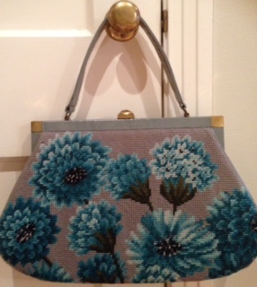 This needlepoint bag is stunning. Gorgeous teal flowers with a gray background. Each side is the same. There are metal feet on the bottom, something I really like. Inside on one side is a large zippered pocket and sewn on top is a pouch pocket. On the other side is a pouch pocked, perfect for sunglasses. It measures 15 in in width x 9 in height. A nice brass closure with a handle the same color as the gray trim.