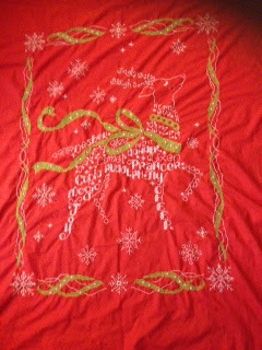 I gave her another top I'd recently embroidered, and she was so excited. The reindeer is stitched in white holiday words, a lime green sash, white snowflakes, pink nose and cheek.
