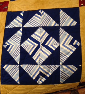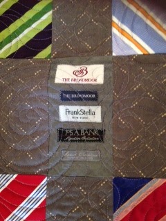 A lot of you know I call my husband Handsome. When we first married, he gave me a card signed with Handsome Husband. I shortened it. (And Handsome is a pretty nice looking guy. )I grew up when working men wore suits to their job and to church, to shows, etc. I like the look. Handsome’s career began at a large accounting firm and he wore the “uniform” too. He especially liked ties and for a long time, never threw any away.An employee at his company makes quilts. After a chat, he decided to have one made into a quilt. Take a look: