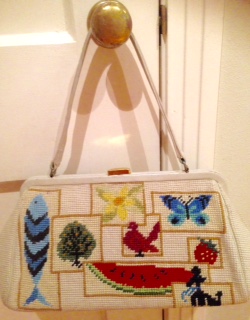 But I digress. Back to the handbag. Both sides are the same. The bottom stitching features a long magenta rose. The stitching is done in wool. A cute fan shaped clast with a little longer than tote-sized handle. The inside is done in peach satin with two flat pockets. No maker's mark. On the bottom are four feet.