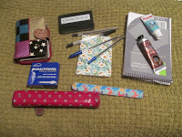 Isn't it adorable with the pink and red flowers on the black background? It has a very large center pouch with two small pockets on one side and one zipper pocket on the other. On each side of the pouch are side pouches. In one, I store the cross-body handle. I thought the bag would be larger; sure, I could have used a tape measure and blocked out exactly how big. Instead, I went with the "is it the same size as a piece of paper?" method. lol