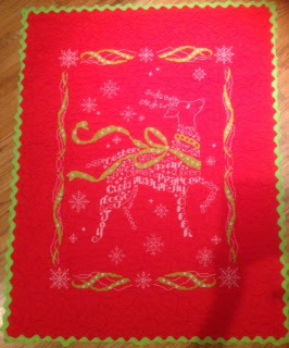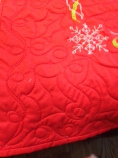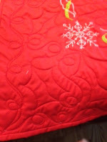 I asked my sister for help with the quilting. I trusted her judgement on coordinating fabric. The quilter put a holly berry stitching in the perimeter and a random one in the center. I added the matching lime green rick rack,