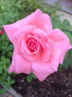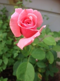 A few months ago, we toured the garden and she showed me a rose plant in a pot with a giant pink bloom. She said she had two cuttings rooted and I could have one. She found her shovel and worked the ground with it. The grasped the main stem and pulled. It came out all right, but not with ideal roots. We both frowned and wondered if this one would make it. She said to try and if not, I could have the other one.