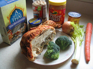 Leftover rotisserie (barbecue) chickenNoodles (rice noodles, egg noodles, ramen noodles or any pasta of your choice)Veggies (broccoli florets, onion chunks, carrots sliced thin, mushrooms, celery, or any others of your choice) Note: You won’t find any peppers in Jo’s recipes because she doesn’t like them - but feel free to use them as well.Garlic - 1 clove minced, or ½ tsp of canned chopped or minced (or more if you prefer).Peanut Sauce - see recipe belowPeanuts - unsalted dry-roasted - may be chopped
