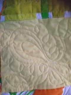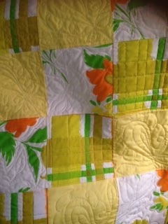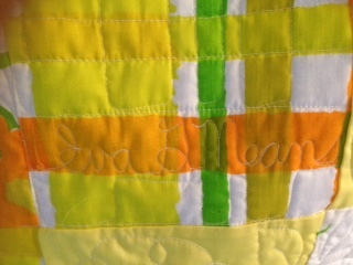 First, she went fabric shopping for the backside. She asked me if there was anything in particular I wanted. I said no, except for one thing. She had had Mom’s name quilted on hers and I wanted the same for mine. Done.