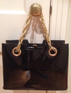 There's no label. The center part clasps shut and the sides envelope open, revealing pockets where small or flat things can be store. The handles are a classy brass-toned link which loop through a hole and fasten to a tab. Does it remind you of a vintage designer bag? How about a Chanel style. I'm thinking all this is missing is the big "C".