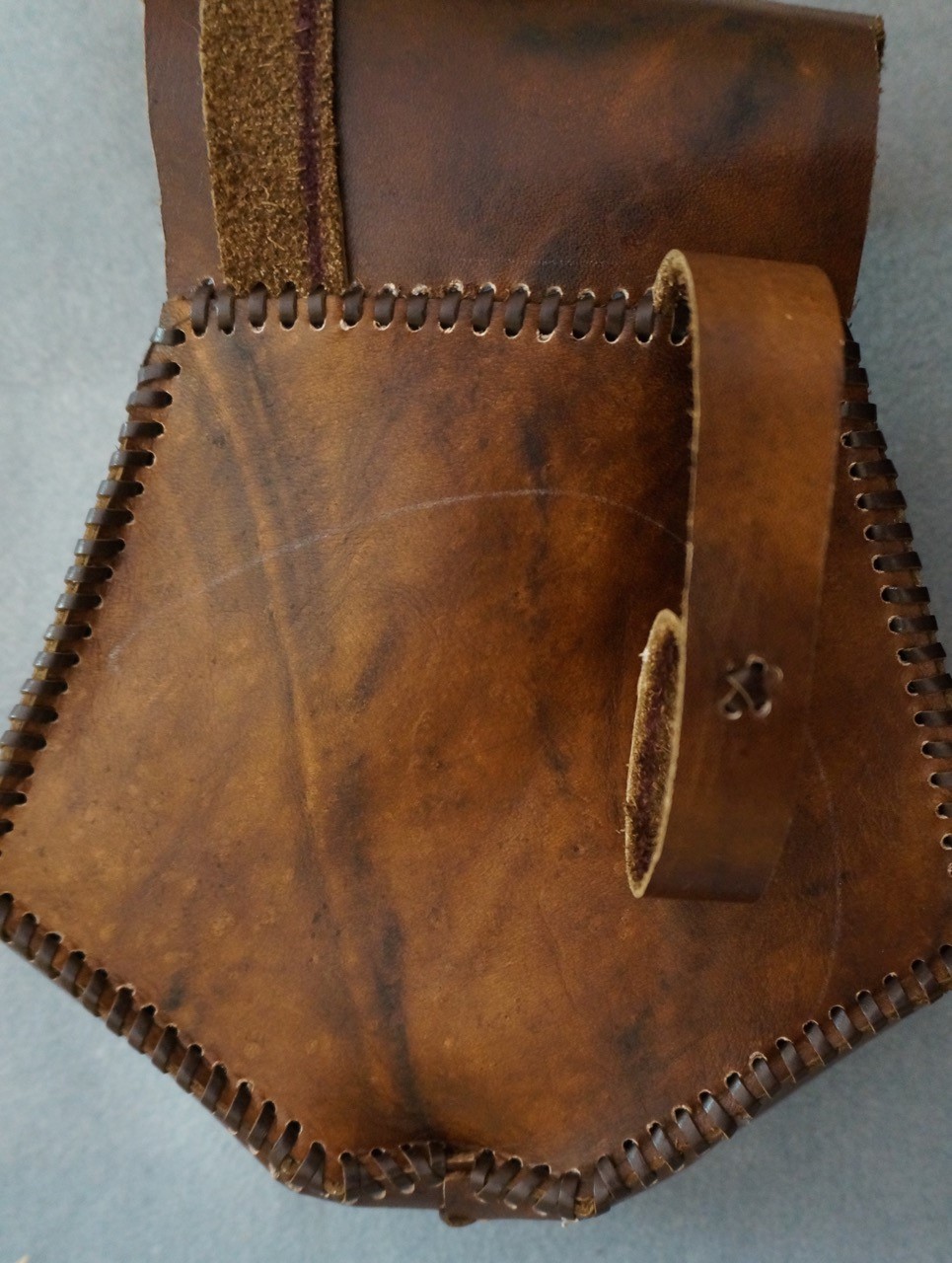 The reticule is designed to hang from a belt. Before lacing on the flap to close the top opening, I made two strips the right length, and laced a loop at the top of each. They were then sewn into the back through two sets of holes.