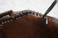 A fashion plate from the 1860s provided an unusual shape that fit with the leather pieces I had on hand. (Thanks to www.katetattersall.com for originally posting this gem!) After tracing the pattern on the leather and cutting, I punched holes along the edge and began lacing the pieces together with a flat leather needle. (Note, this did require a bit of counting to make sure of the fit!)