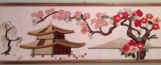The scene is Oriental, a pagoda and tree. This one is unique because the leaves are tiles as are parts of the pagoda. A braided piece was glued and pinned, then specifically marked gravel was put in the section.