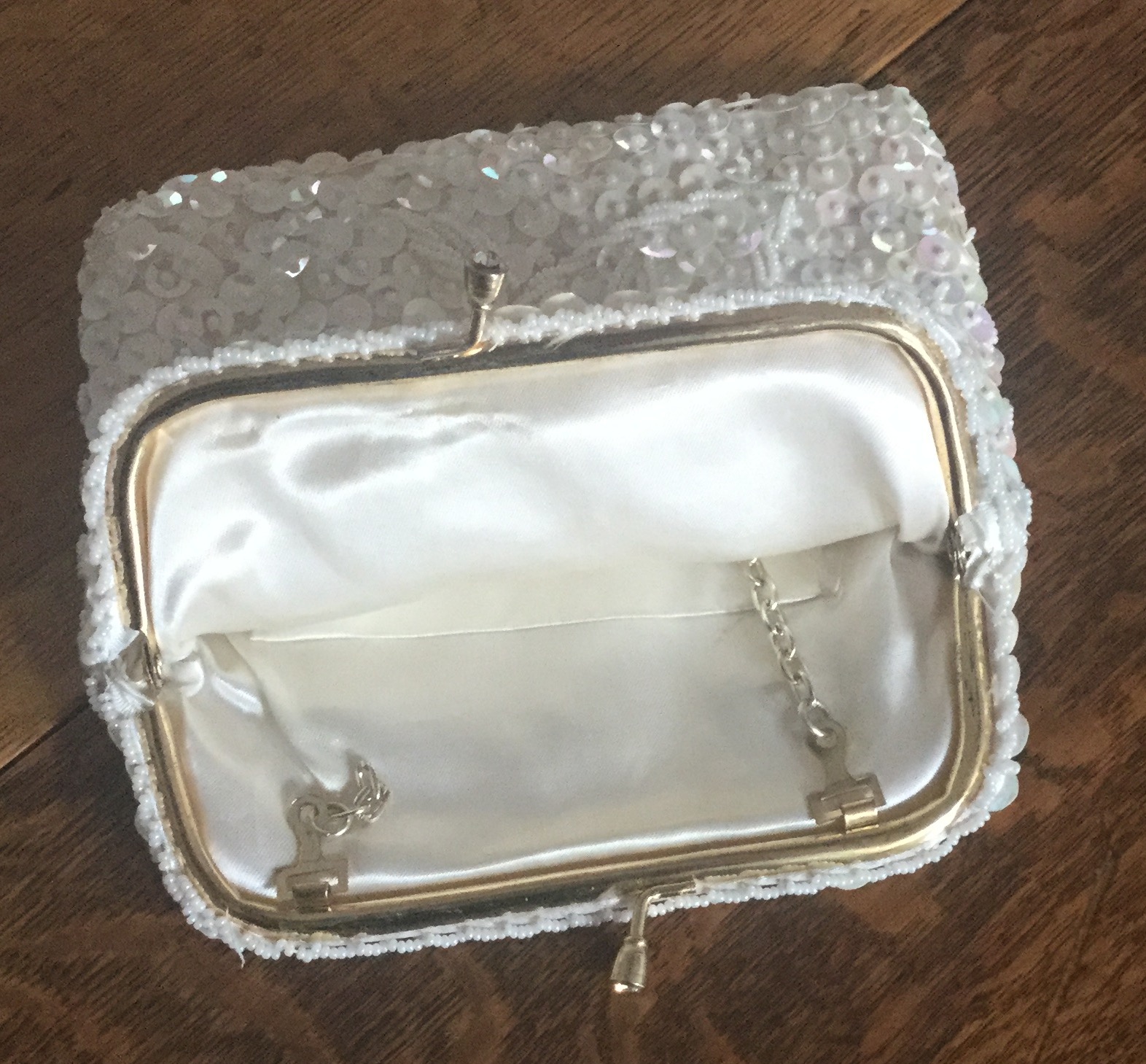 Anyway, this was a time when you’d dress up for New Year’s Eve, even if you were just going to a house party. I can remember wearing a floor length black velvet skirt and a red blouse that year, along with this lovely little clutch, and feeling quite mature (I was about seventeen at the time). The moment was ruined when said boyfriend’s best friend asked me if I’d gained weight, but I digress. The point is, I still own that purse, but I’ve never worn it since that evening.