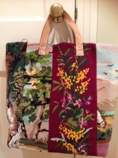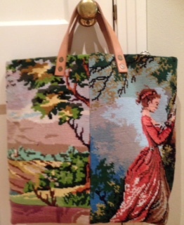 Cool--right? This bag came from the South of France and the maker used several pieces of canvas to craft the bag. I fell in love with the lady. The bag is about 14" x 14". A little large for me to carry as an every day; however, it is perfect for--needlepoint!
