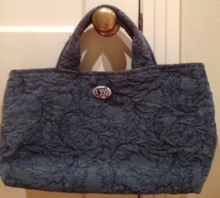 The vendor was known for making jackets, yet did dabble in handbags. This is a heavy weight fabric, fully lined in dark blue with a pocket. I have to say this is my perfect size and style. It holds everything and has my favorite tote handles. I did put the pin on because why not style up your handbags. This giveaway came from a now defunct store which had been hugely popular when I was a teen and young adult.