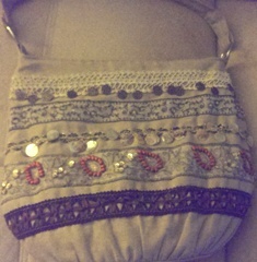 Autumn is my favorite time of year and this fun little handbag is one I use to knock around in. Featuring rows of glittery cord, polished shells, and burnt orange beads, it has a real Bohemian flavor. I love this little bag because it goes with everything I wear in the fall.