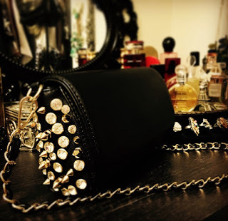 My current favorite handbag is this gorgeous black leather purse that has spikes and rhinestones details on its sides and a gold chain handle. It’s bold, very girly and perfect for a night out on the town.