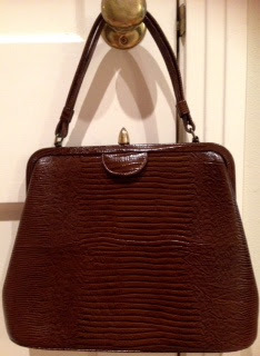 As you can see, it is brown and could be lizard, maybe even faux lizard--I really don't know. She even had matching shoes and I wore those until my toes pinched too much. The inside is a soft suede-like fabric in the palest pink. There's no maker's mark. A zipper pouch on the inside. Except for the four scratches in the interior, I would have thought she'd never carried it, but she did. This bag has very classy _all over it._I love it! And I can't wait to show it off. Thanks, MOM!