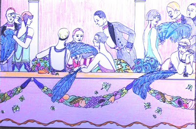So when traveling this summer, I visited an art museum and while scanning through book titles, I found postcards to color featuring fashions from the 1920’s. Since I was a Clothing and Textiles major, this found a home with me: