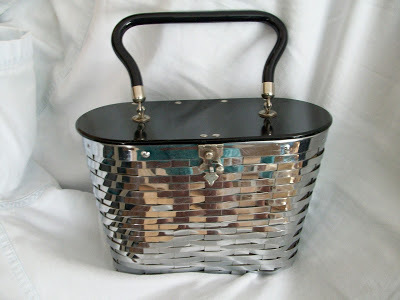 This is a Dorset Rex 5th Avenue NY purse. The aluminum woven basket oval body is topped with a black Lucite lid and handle. The lining is salmon; the closure is a flap-and-hook type – also aluminum. The bag is 5 ½” high, and the oval is 8 x 3¾”.
