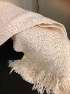 Isn't it lovely? The shawl is wool, probably crocheted in a wave pattern (If you know, please tell me!) It measures five feet by 18 inches. And the cost? You won't believe this. A mere $7.00.