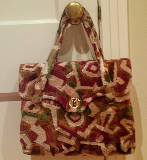Here's the scoop: It's made of a crazy quilt patterned velvet-like fabric in brown tones with a dash of green. The handles are in the short tote style. Has a gold-toned closure. Inside is a large pocket with a snap closure and a small side zipper pouch. And an open pouch--whew! I like stashing needlepoint somewhere and this looks perfect. It looks sorta hippie-ish, don't you think? I believe it will be perfect for winter. Sorta resembles a Kelly bag.