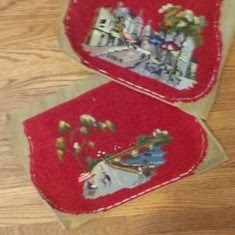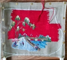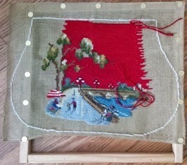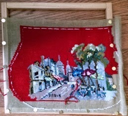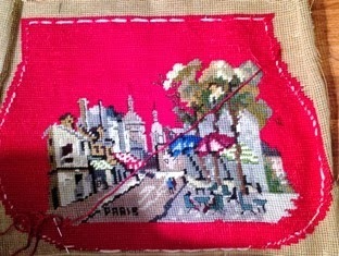 ~Handbag Monday~ I began with a vintage canvas I found on eBay. I stitched the background in red silk, using one strand. The street scenes were already done as was typical of these bags. Once completed, I turned the bag into the finisher at the needlepoint shop. They used red leather on the handle and the gusset. Beige silk moire was used to fabricate the lining.