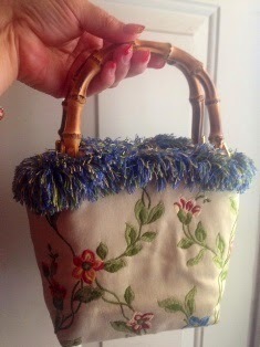 Handbag made by Frankly Fabulous and bought at a resale shop. I saw it sitting there on a shelf, this cute little embroidered handbag with gorgeous bamboo handles! The blue, green and yellow fringe spoke to the hippy in me! I love fringe on just about anything and this sassy little bag had it all! Gorgeous flowery embroidery, earthy bamboo handles and the FRINGE, baby!!! Feminine, soft blues like a robin's egg and bamboo from the far East. I was shocked my name wasn't embroidered inside! xoxoxo