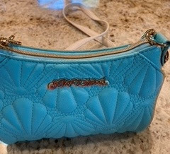 Turquoise is my favorite color, so when I saw this bag at a store in our small downtown area, I was thrilled. But I didn’t like the white straps that were on it. They looked out of place. But the Betsy Johnson bag was on sale for 75% off, so I bought it. Then I went on Amazon and found gold chain purse handles and ordered them. When they arrived, my husband put them on for me and now I love carrying this bag when I’m not traveling. It’s just the right size for my wallet, phone, a lipstick and an inside pocket for me to carry some cash and credit cards.