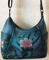I have an assortment of appealing handbags in my closet, but since that first Anushka arrived, I confess, I've rarely touched them. Perhaps my daughter grew tired of seeing me toting the same bag every day. I think, though, that she just wanted to give me something I wouldn't have purchased for myself. You see, I thought one Anushka was all I needed. Ah, but it's so nice to now have two. I love the new bag's cool shades of blue, and the curves of the flowers and leaves. I also appreciate how roomy it is. If I want to do a little work away from my home office, I just tuck my iPad and notebook in beside the lavender Anushka wallet I finally purchased with another set of gift cards, and I'm all set.