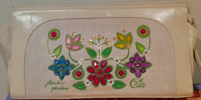 A clutch entitled "flower garden." Enid named each of her creations. This one has a nice roomy pouch with a pocket, and a very handy wristlet. Alas, while carrying it, the seam has become unsewn. I have to take my treasure to the shoe shop for a tiny repair. And unfortunately, the perils of carrying vintage sometimes. I found the bag at an antique mall. I'd just begun buying Enid Collins and noted this one was different from the traditional totes we know her for. As I learned more about the company's history, I discovered it had been sold to the Tandy Corporation. Thus, the logo change from "ec" to the small horse with the "Collins" wrapped around it.. Enid did produce some designs for the Tandy Corp. I *think* I paid $24.00. A bargain for something quite unique. Although I did hesitate before completely deciding and went through the whole store before going back and claiming my prize. What do you think?