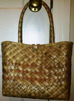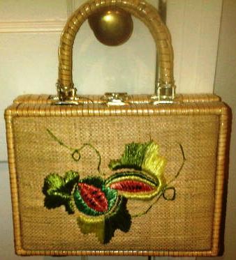 The box-shaped bag is made of straw with a gold clasp, nice vinyl interior, and embellished with raffia fruit and leaves. I remember it was one of my first purchases on eBay. The rattan is plastic coated which makes it nice for surprise tropical showers. (The brownish tone of the photo doesn't do it justice. Actually is more blonde. Alas, my photo skills are lacking.) On the bottom are leather straps covering the gold hinges, and gold-toned feet. The label on the inside pocket says "Simon, Made in Hong Kong, Styled by Mister Ernest."