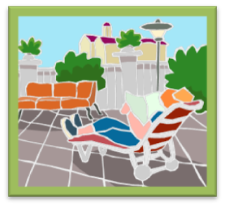 -A lounge chair by a body of water. Grass underneath my feet. Cold bottle of diet Coke, soft breeze to stir the heat away.