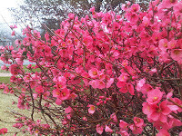 In the deep South, quince may bloom as early as January. It is a member of the rose family, and the odd fruit bears a sweet, apple-rose flavor. Flowers emerge before the leaves and hold their bloom until the leaves are completely expanded.