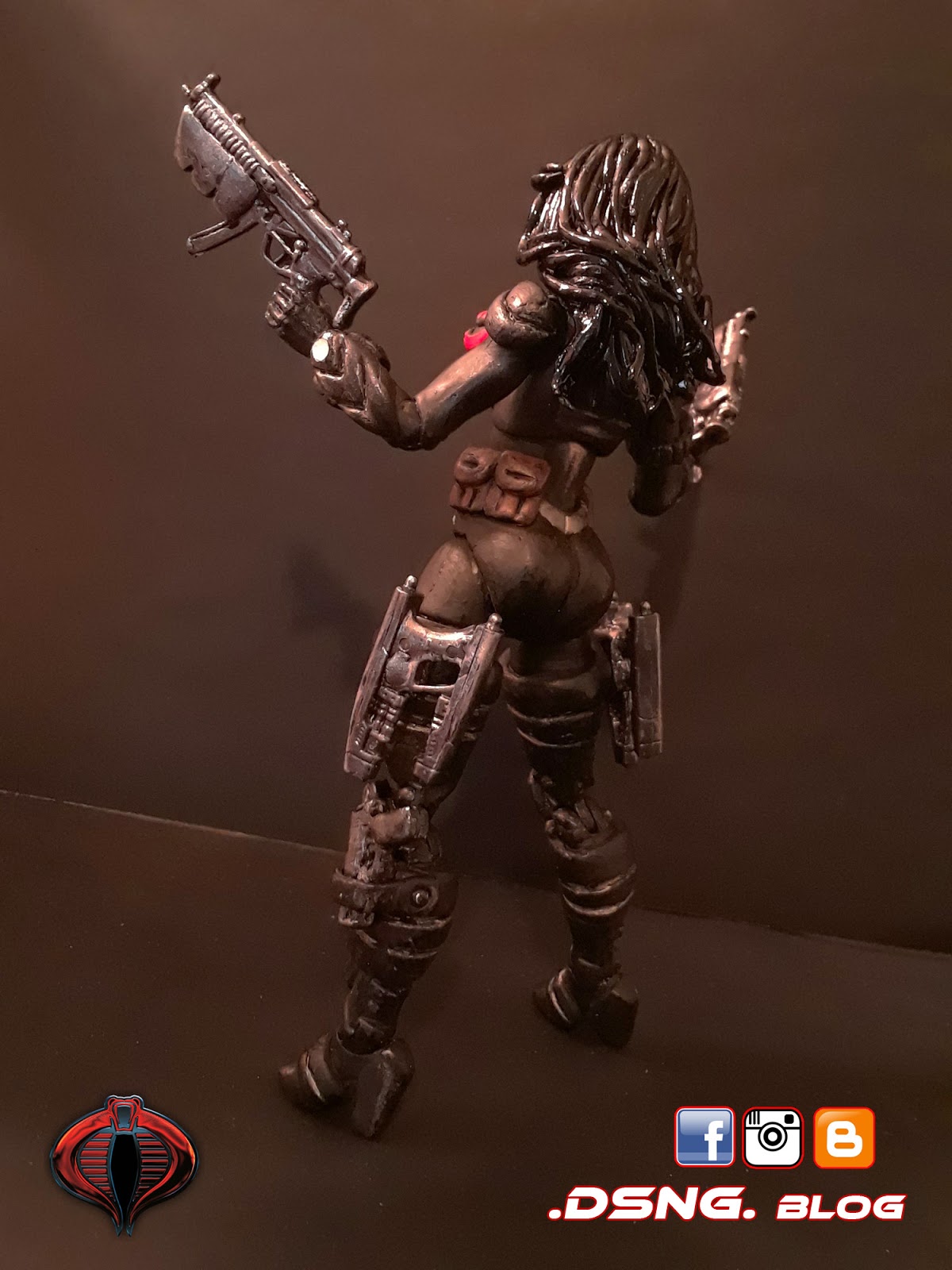 There is a pouch attached to the back of her belt via a magnet, making it removable. And two sub-machineguns are held via magnets at her thighs as well. She also has a special removable Arm Blaster affixed to her left arm, which had twin barrels and a central blade... you can see it better in one of the side-view pics. I did make her thick / thicc, per my personal preference.