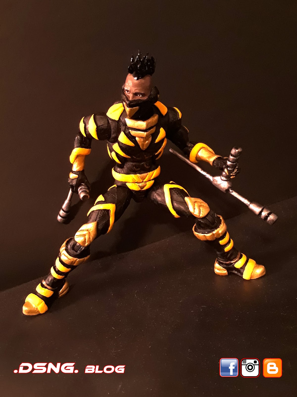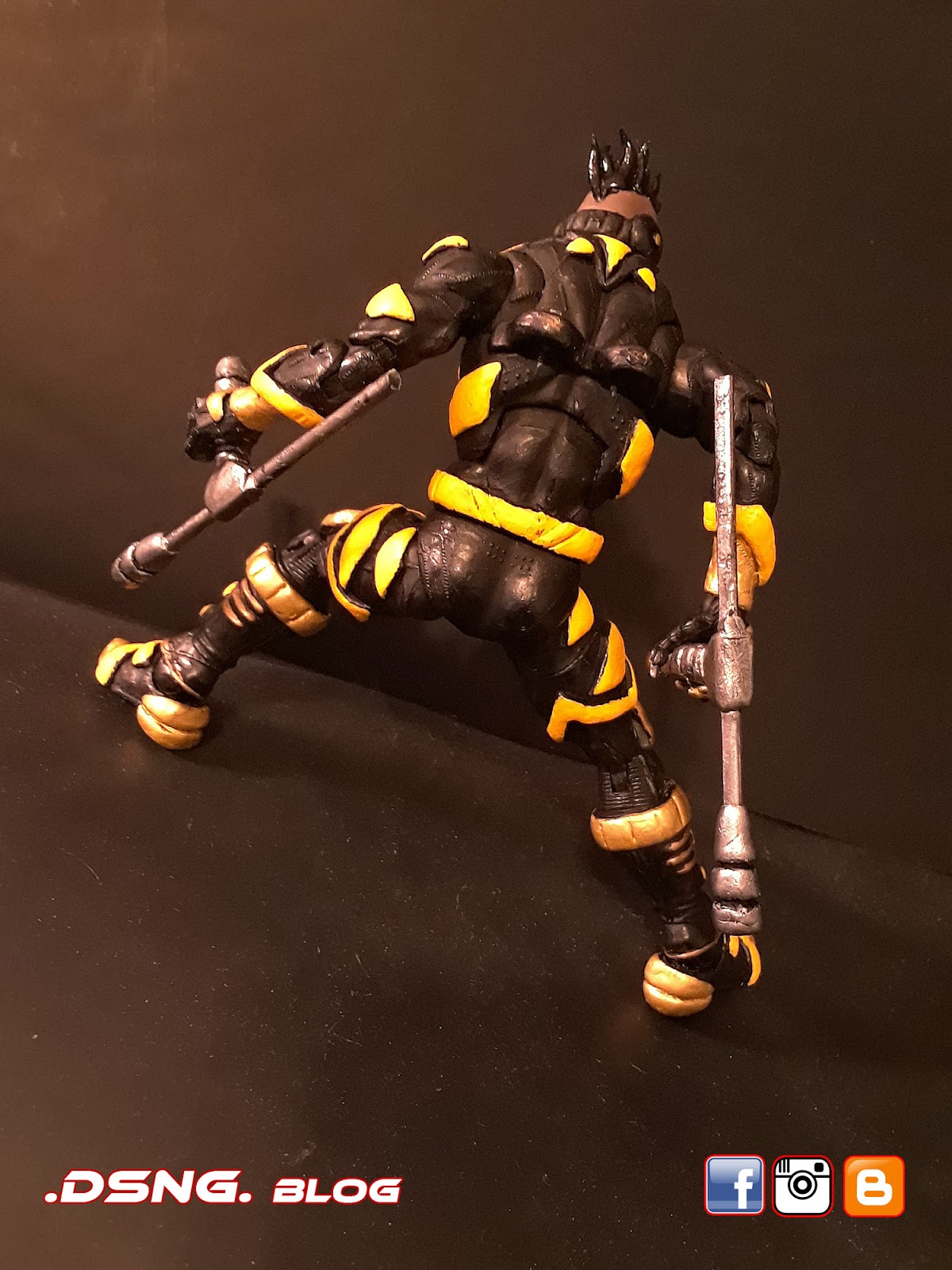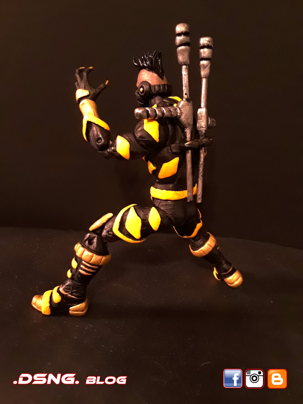 The base body was Marvel Legends Erik Kilmonger. The lower legs came from demolition man. His batons were fully sculpted as were his armor pieces. And the head came from Star Lord. I pulled off Star Lord's hair and worked with a bald head. And his cool mohawk was sculpted, along with his mask and his "tiger stripes". Yet a Liger is a hybrid between a lion and a tiger; so this guy has incredible agility, along with electromagnetic powers.
