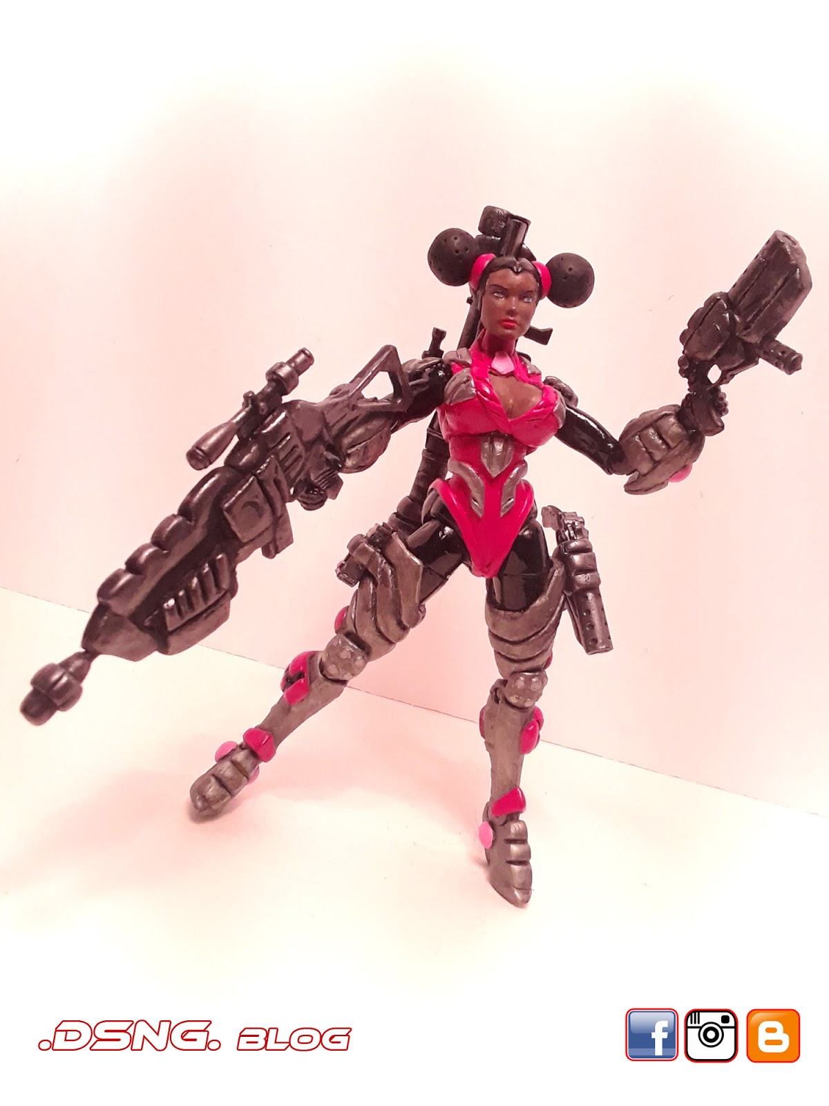 Brief Toy Recipe:The base figure was a mixture of Marvel Legends Enchantress [torso and heels] and MockingBird [top bust and the afro-puff head, which was repainted]. The two sculpted puffs are attached by magnets, so they can be easily removed. And the second helmet-wearing head, featured in the second gallery, came from ML Captain Marvel Carol Danvers. Her legs came from Mockingbird as well. I did a lot of sculpt work on her and eventually gave her four guns. There is a magnet concealed on her left hip, and another magnet on her back, to help with the weapon storage. Tamiya and Vallejo paints were used, and she was hand painted.