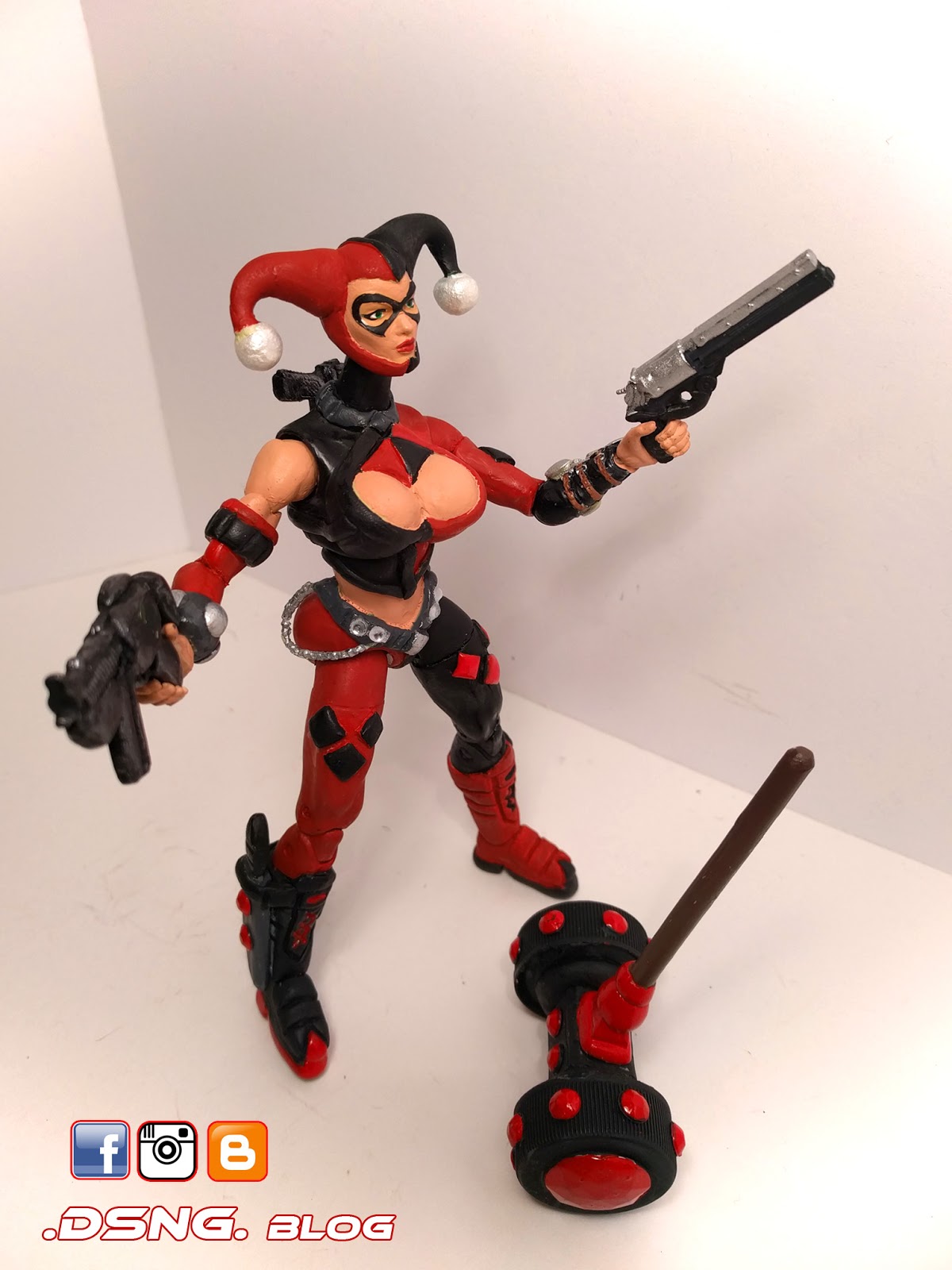 Her clown hammer is very heavy. It was created from a slim base sledge hammer that comes from one of the WWE HHH toys. And I sculpted the enhanced center piece, along with the heavy round mallets fixed on either end [from soda bottle lids] and I added all of the blingy gems, and colored the gems gloss red. She can hold it, but it weighs her hand down.