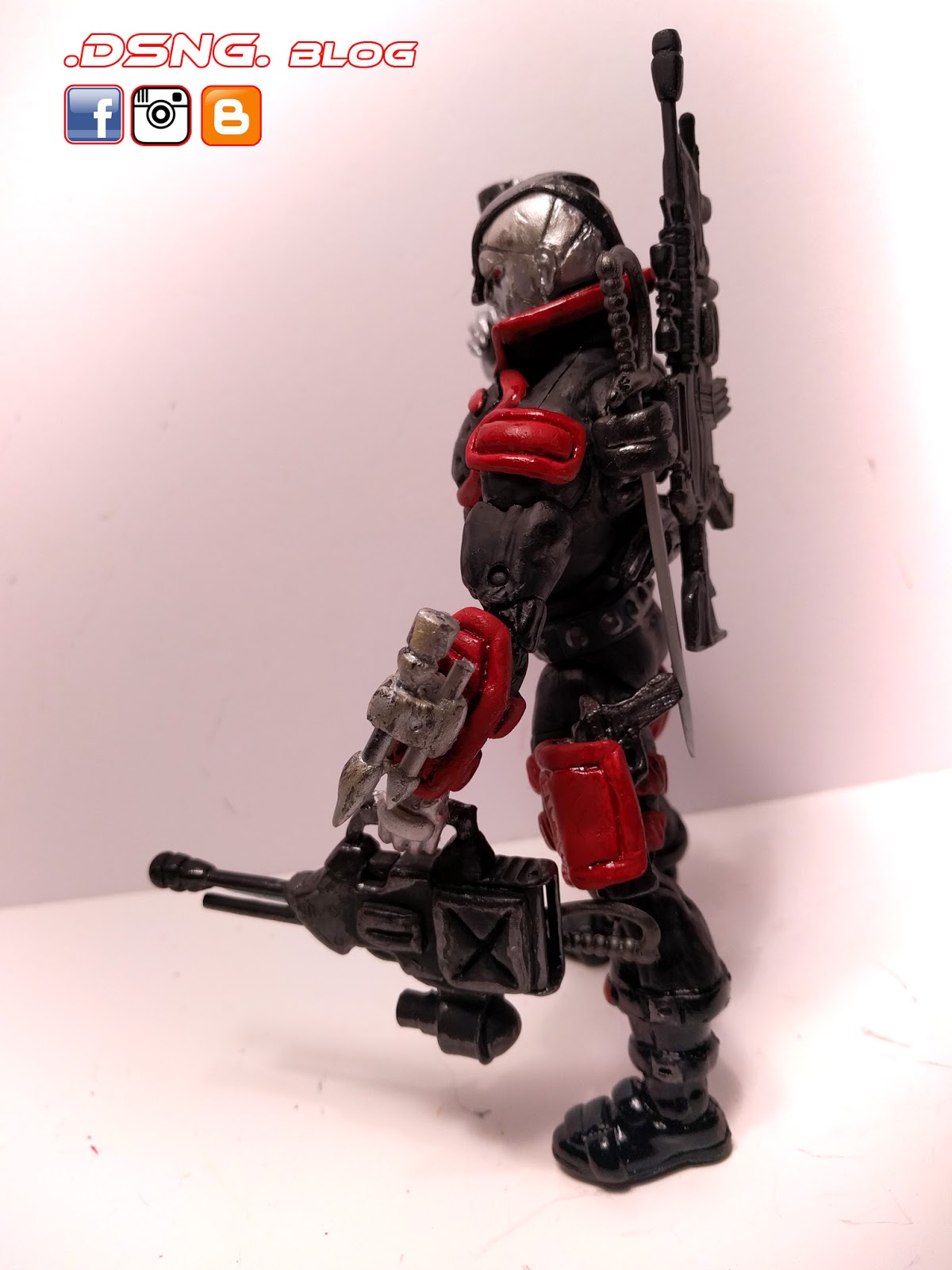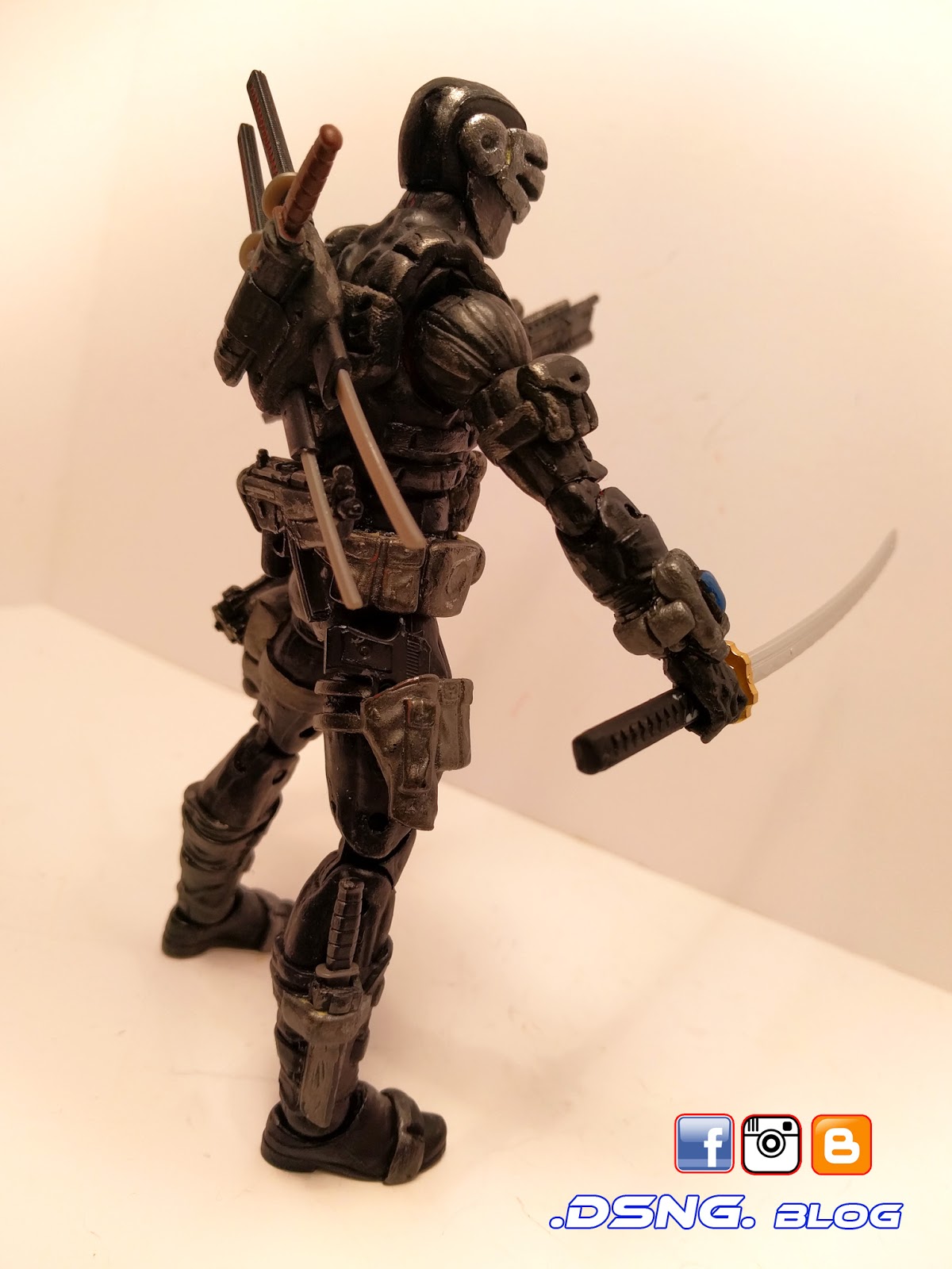 There is a sculpted cool “I-phone device” attached to his right gauntlet, while his left gauntlet hosts an extra dagger. The right thigh’s gun holster was from Deadpool, but everything established on his left thigh was sculpted from scratch, and an extra magnet as added in there, for his submachine gun. And Tamiya paints were used to color him, in shades of flat black, metallic gray, German gray and gunmetal. In total, he has 6 swords and 5 assorted guns, which are held on his frame.