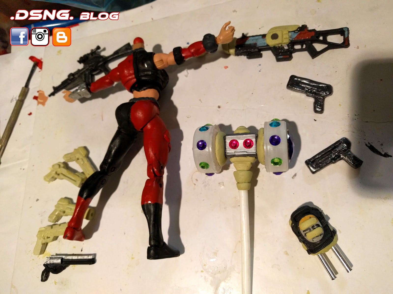 The base toy for Matt was the ML Captain Britain [and I enhanced his chest with putty before adding the body armor, gloves and boots]. And the Captain Marvel Carol Danvers was used for Gloria’s base; plus the extra mohawk-head from the Carol toy was used as the base for creating Gloria’s aquatic mask via putty, in stages. Their removable masks and costumes were fully sculpted and hand-painted with Tamiya acrylics, and the base of the mask for Matt was gotten from a McFarlene TitanFall toy – but I had to enhance it greatly with putty as well. Some of their weapons have magnets and those guns were customized. Like and Share! - Article written by the artist & author of the DSNG Sci Fi Series