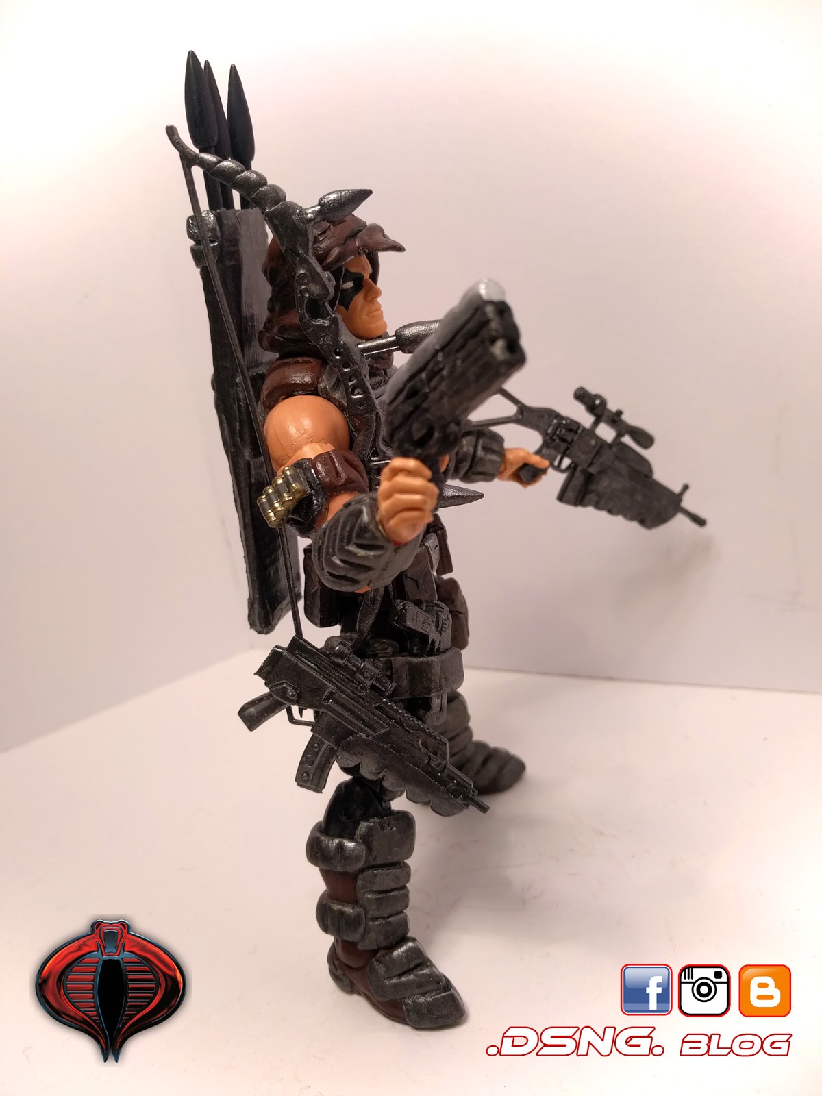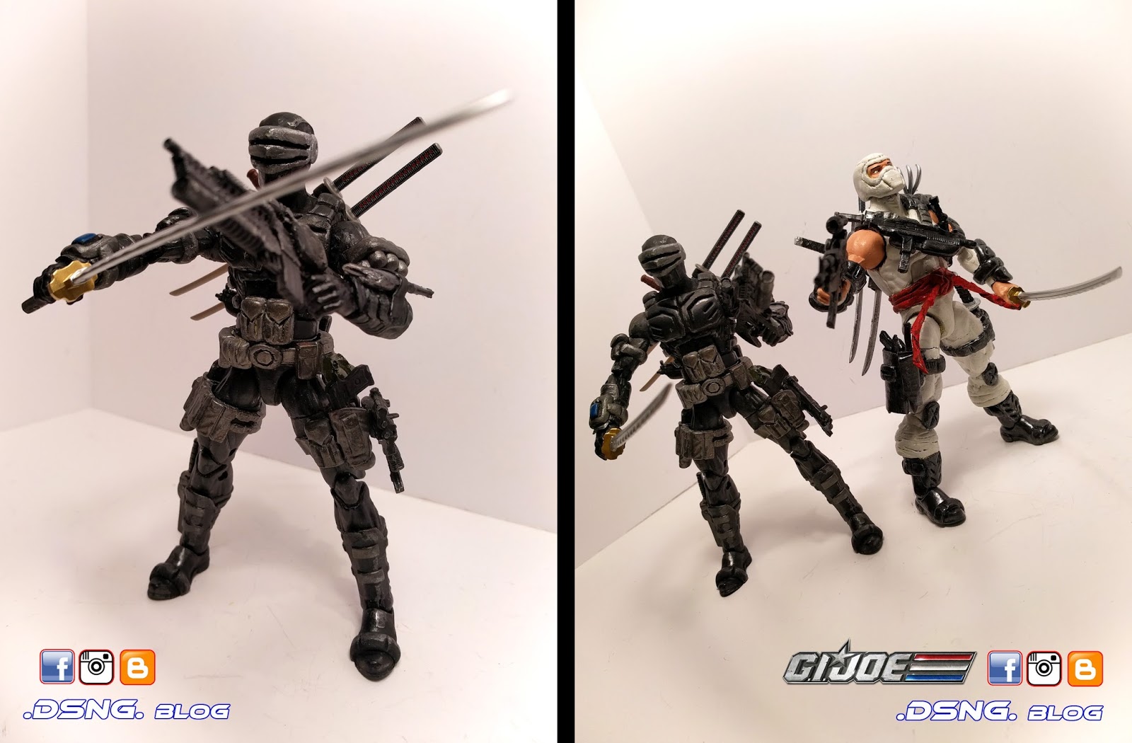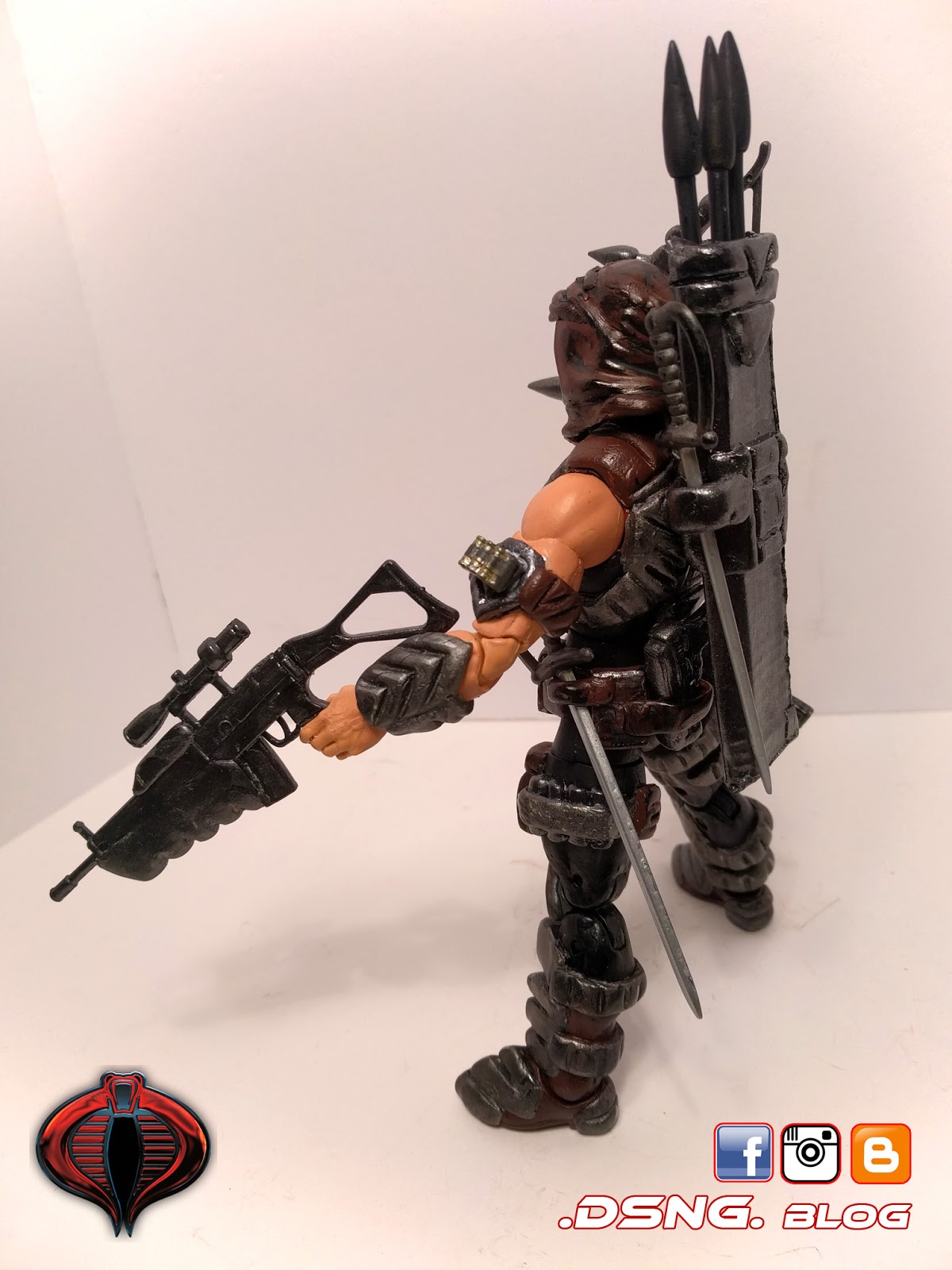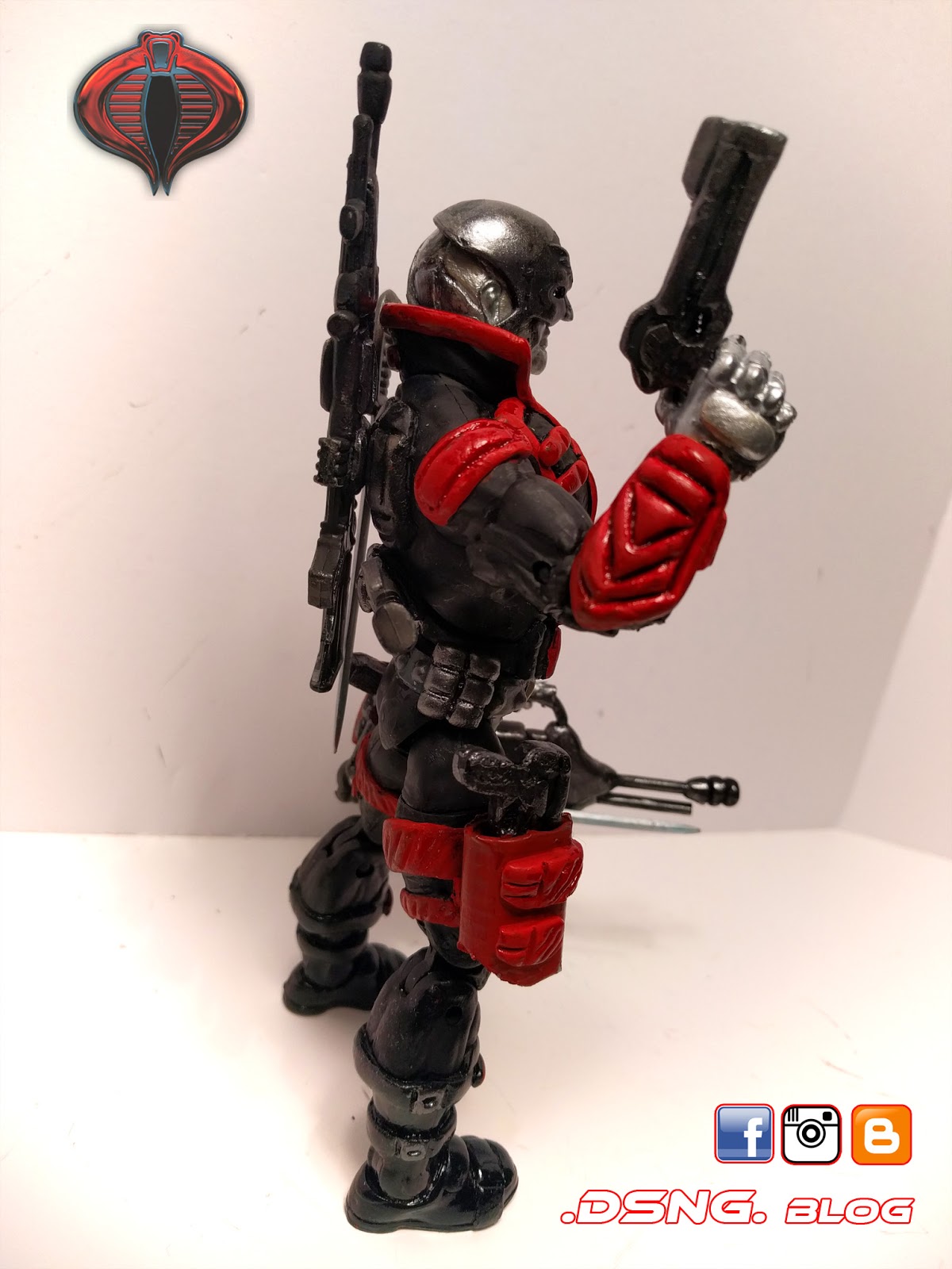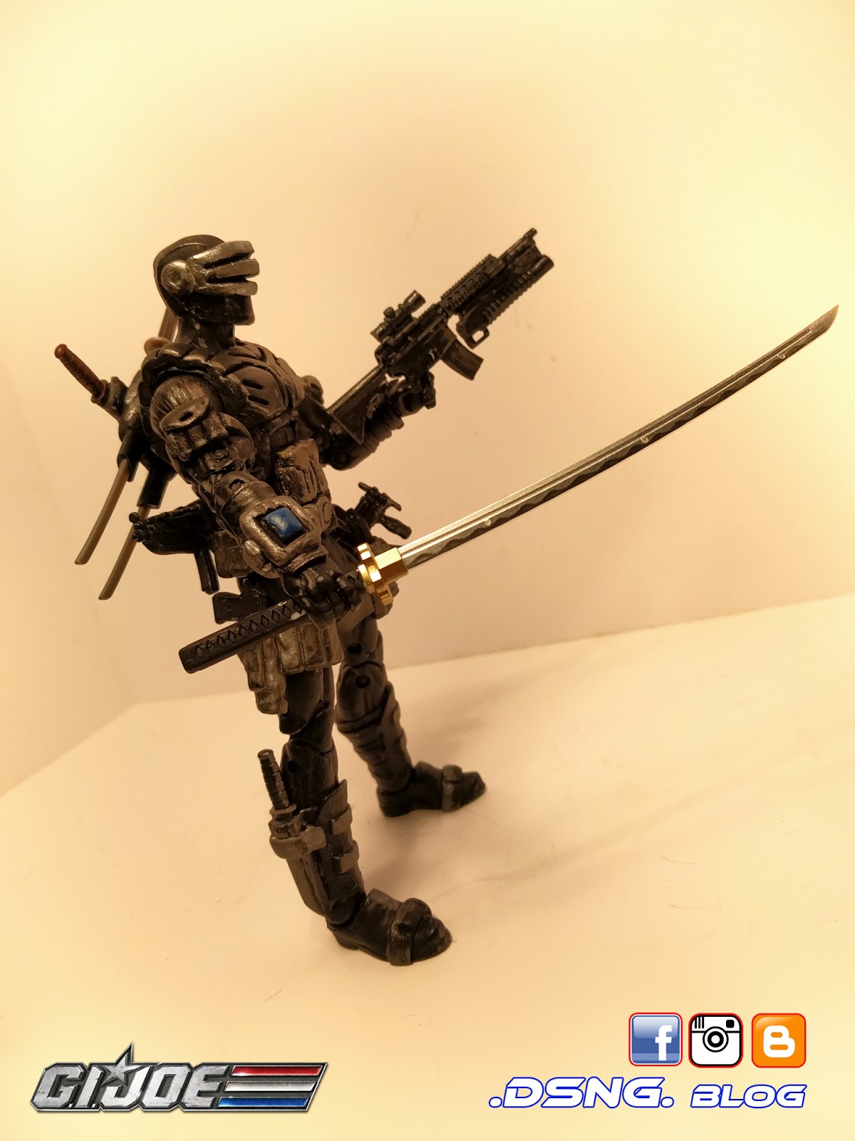 In total, my Storm Shadow has 7 swords [small and large], 3 assorted guns, and 1 grappling hook [which is wrapped around his left shoulder]. Btw, my custom Snake Eyes was also posted in this blog! Stay tuned for more!