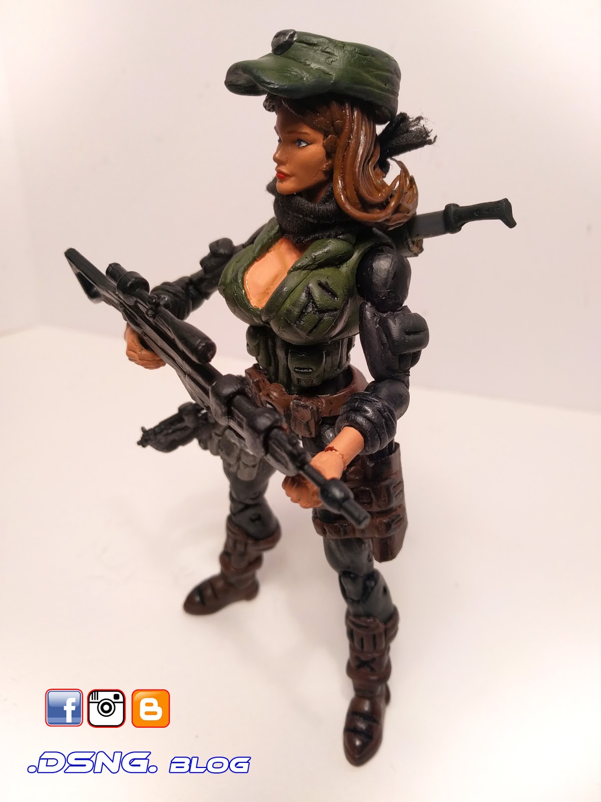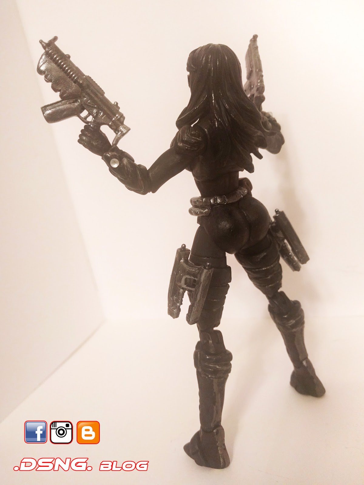 Tamiya paints were used to hand-paint her. And she has four guns and one sword, held to her back via a magnet. Her ponytail is held by a magnet as well. The original DSNG blog article on Elena is over Here. Enjoy!