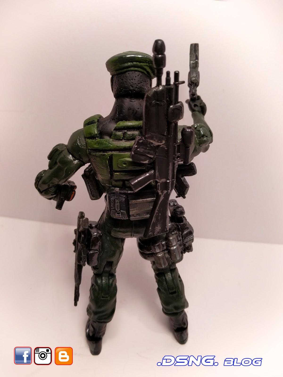 I refrained from adding a saber / ninja sword to his back, since I didn’t feel that it was necessary [But my Destro Custom had such a feature]. The pouches on the sides of his biceps were sculpted, while the pouch held behind his belt was fodder, as was the M18 Smoke-grenade storage canister held on the left side of his torso. After the sculpting stage, I painted him by hand, using two different greens, gun metal and black [Tamiya paints].