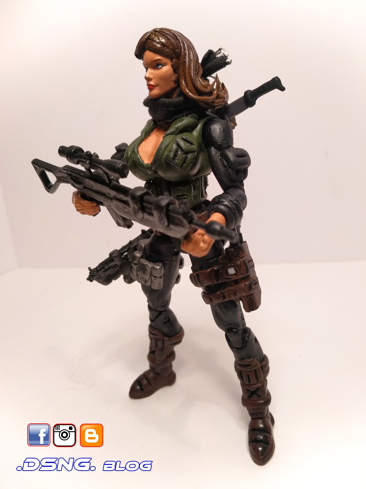 Her weapons were customized and I cut a small white cloth to make her scarf [after I repainted it black]. Plus I added a gimmick with her sniper rifle... so the weapon's long barrel can be disconnected and held in her hand, or it can be attached to her right hip via a holster and a small 5mm magnet. And per the magnets, the machete / sword held upon her back can also be attached to her right hip as well.
