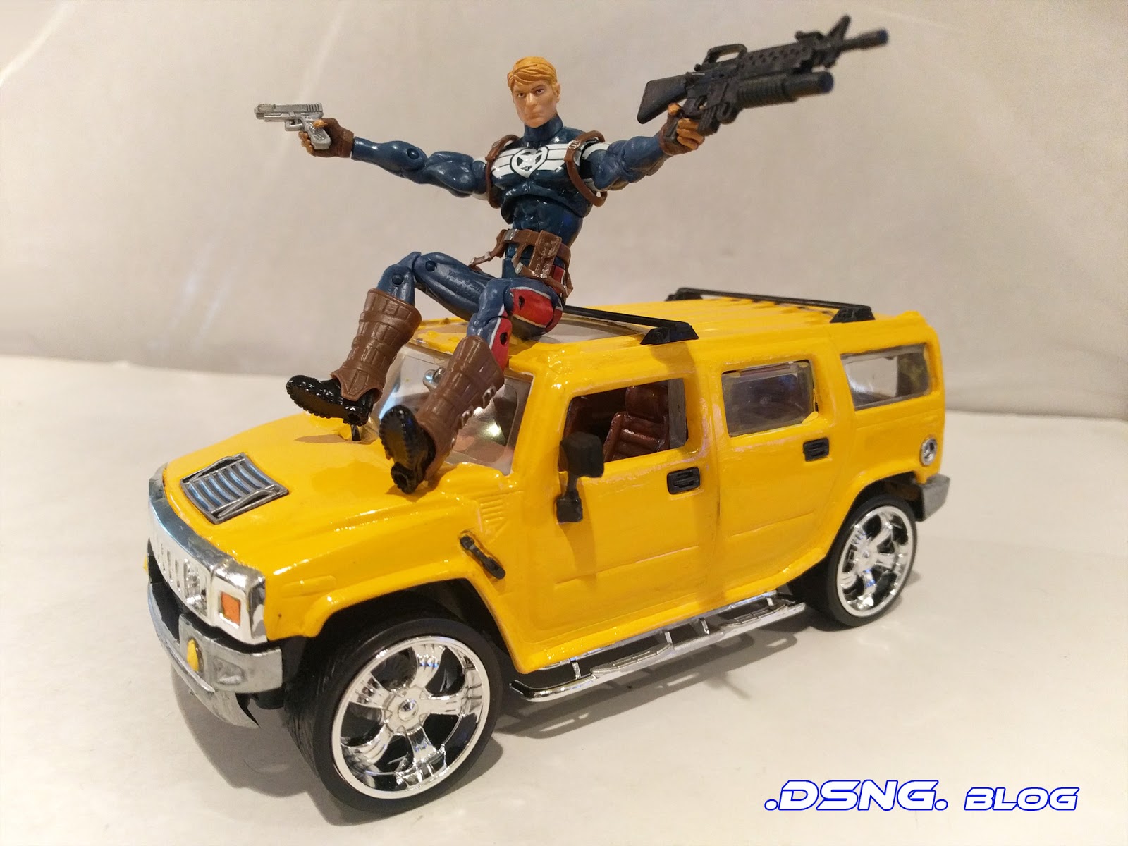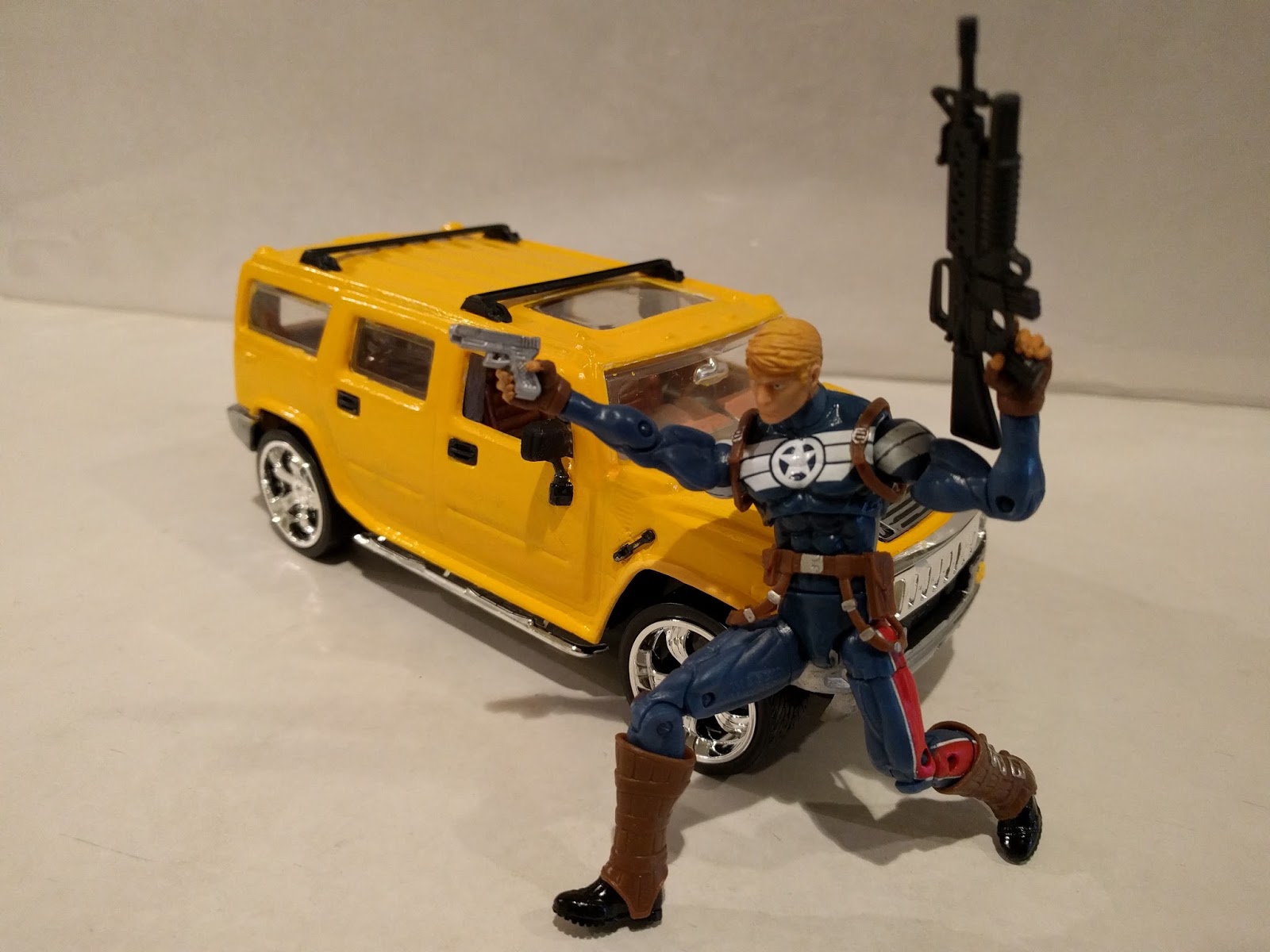 The Hummer H2's scale is 1:25, and it it roughly 7 inches long from end to end, and less that 5 inches tall. In a way, I feel that this yellow Hummer H2 would be good as a beefed-up adult version of Bumblebee, who is often shown as a teenage Chevy Mustang... but that's just my opinion ;)